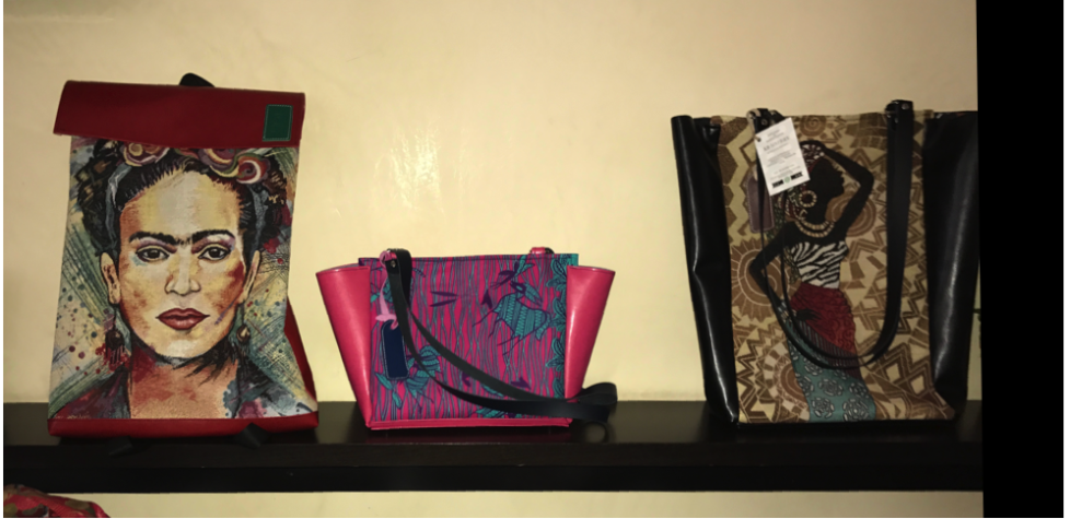 Abajo, bolsos con bandolera de las colecciones Frida Kahlo y Bowie; turbantes con telas africanas (izquierda) y distintos modelos de capazos (derecha).